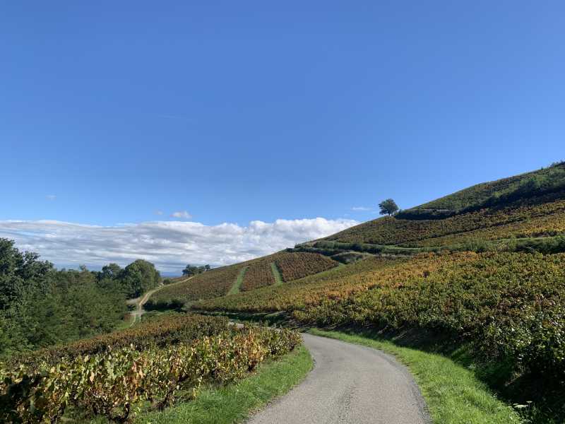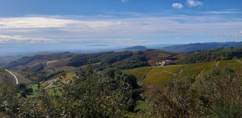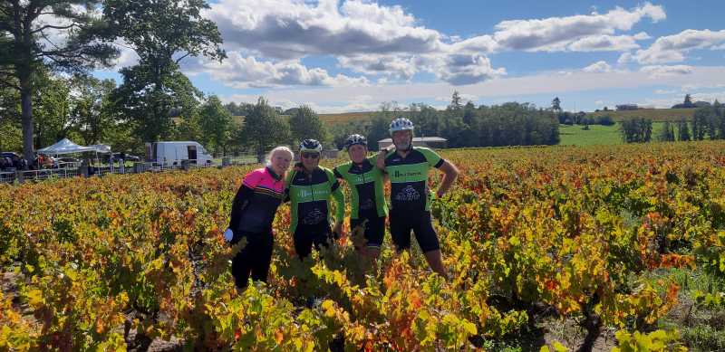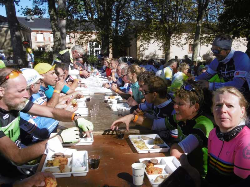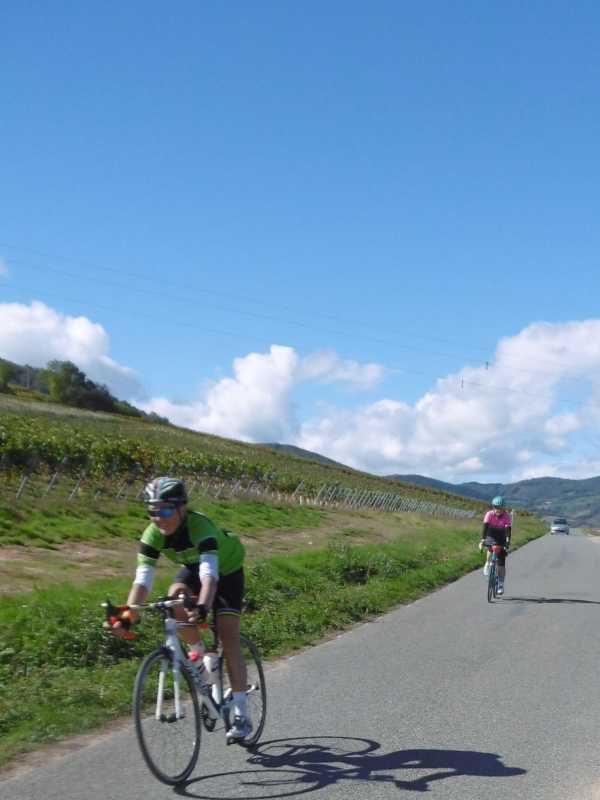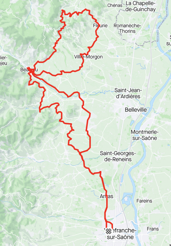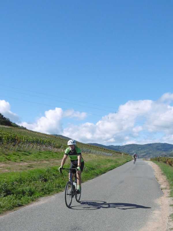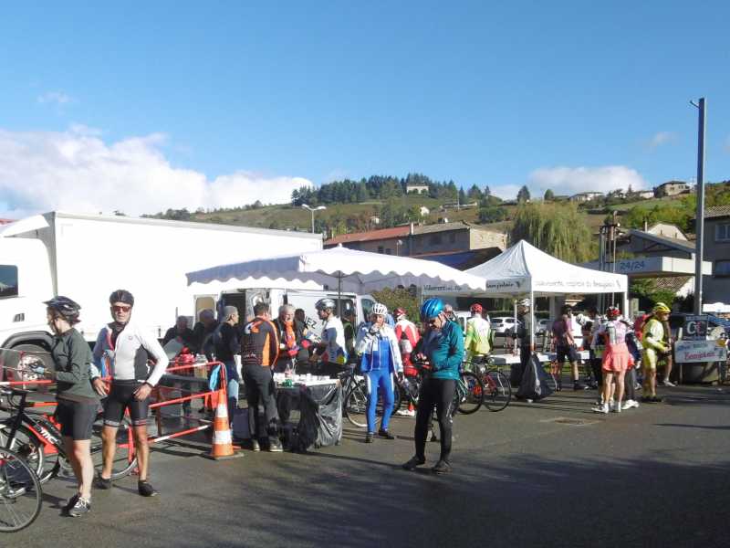 Nous avons découvert un superbe parcours à travers les célèbres vignobles du Beaujolais, qui avaient déjà pris leurs premières couleurs automnales. Le circuit nous a conduit à Arnas, Charentay, Cecié, Beaujeu (pour un 1er ravito), le col de Truges, Vauxrenard, Fleurie, Villié-Morgon, Beaujeu (pour un 2e ravito !), Quincié et Odenas (où était organisé le fameux et traditionnel mâchon). Après avoir goûté le Beaujolais (pour certains